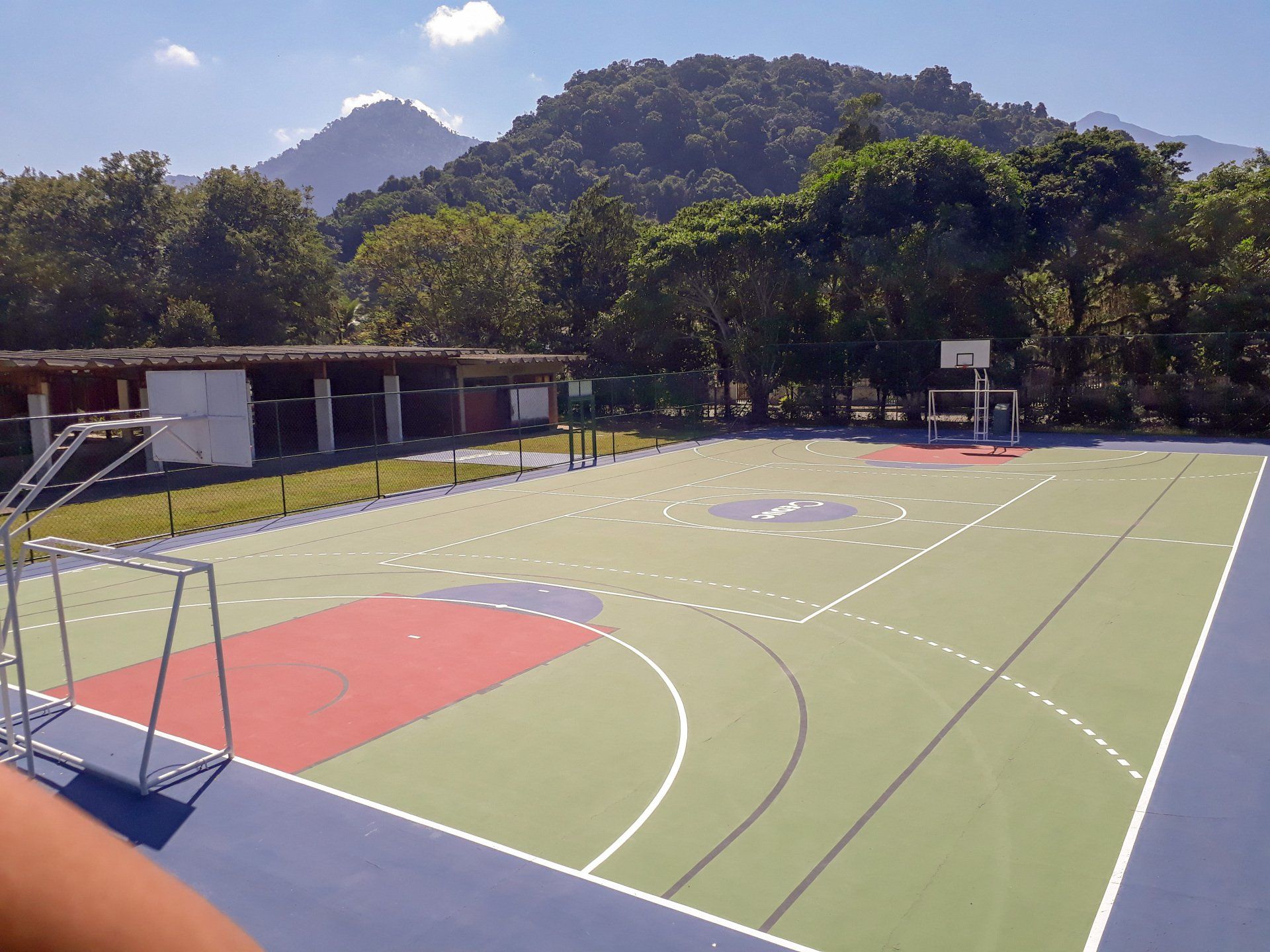 Quadra com arquibancada, tabelas de basquete oficial, rede de vôlei e futebol.